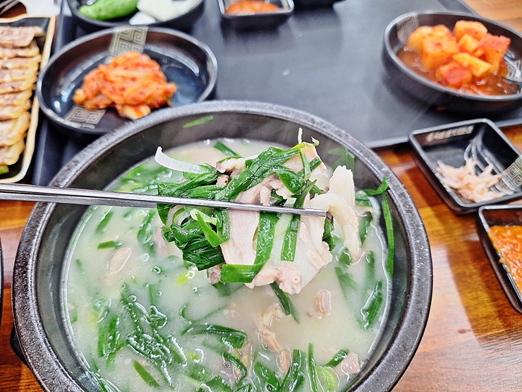 고추, 양파, 쌈장, 김치. 부추와 깍두기가 반찬으로 나온다. 새우젓, 후추와 소금은 테이블에 비치 되어 있어서 취향에 따라 국밥에 넣어 먹으면 된다. 김치 맛은 평범했는데 깍두기 맛이 상당히 좋았다.