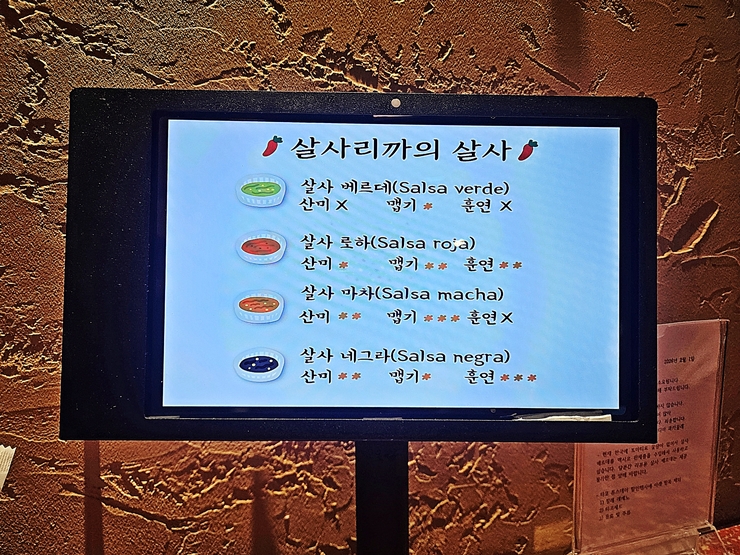 네 가지 소스는 살사 베르데, 살사 로하, 살사 마차, 살사 네그라라고 한다. 뭐가 뭔지 하나도 모르겠다. 산미, 맵기와 훈연 정도가 나와 있어서 취향에 따라 먹을 수 있는 장점이 있다.