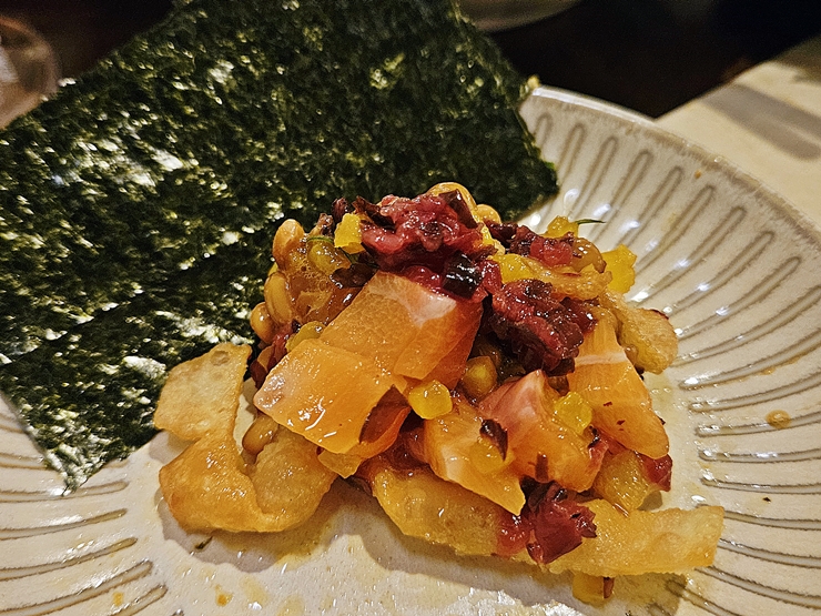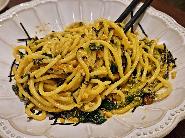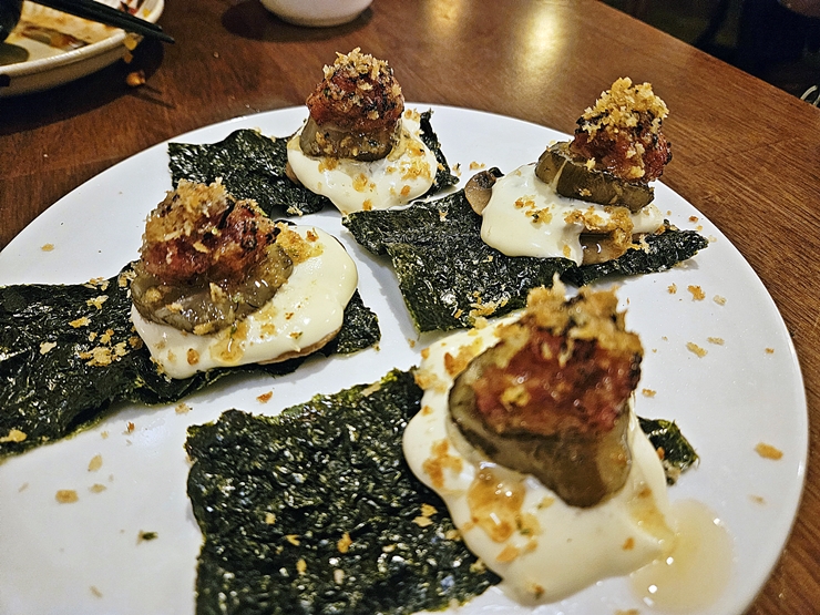 술 안주보다 식사로 더 잘 어울리는 요리다. 우니의 녹진한 맛이 파스타에 잘 스며들었다. 비비는 도중에 연어 알이 거의 다 터져서 좀 아쉽다. 다음에 가게 된다면 연어 알은 다른 곳으로 옮긴 후 비비고 먹어야지.