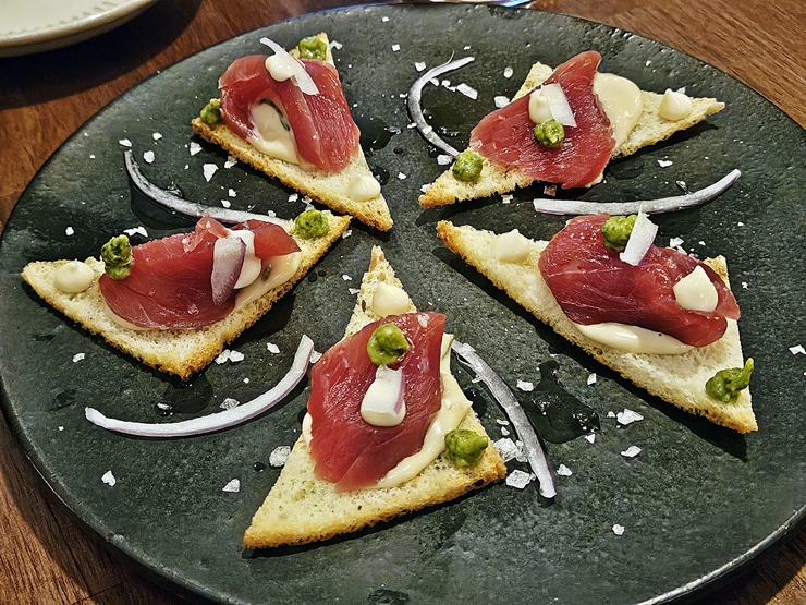 마구로 브리오쉐. 브리오쉐는 브리오슈를 말하는 것 같고, 브리오슈 위에 참치, 크림 소스, 루꼴라 페이스트와 트러플 오일을 올렸다. 아는 맛과 아는 맛의 조합인데 이 맛이 참 좋다. 전채로 먹기 딱 좋은 요리였다.