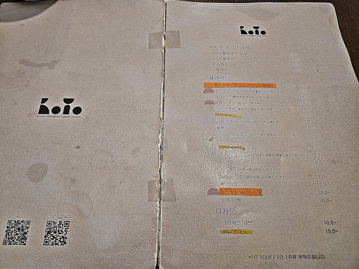 메뉴. 정통 일식을 판매하는 이자카야는 아니고 약간의 퓨전 요리도 판매하고 있다. 우리는 최대한 다양한 많은 요리를 즐겨보기로 했다. 코요의 경우 1인 1메뉴와 주류를 주문해야 한다.