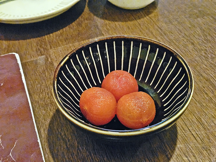 방울 토마토 마리네이드가 먼저 나온다. 방울 토마토 껍질을 제거한 상태로 나오기 때문에 껍질의 질긴 느낌을 전혀 느낄 수 없다. 적당히 달고 신 맛이 식욕을 돋우는 역할을 한다. 방울 토마토 마리네이드는 요청할 경우 리필이 가능하다고 한다. 하지만 굳이 리필을 하진 않았지.