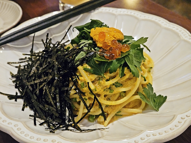 우니 파스타. 서양식이 아닌 동양식 파스타다. 우니를 가득 넣고 오일 베이스 파스타를 만든 후 그 위에 연어 알, 우니, 어쩌고 채소와 김을 곁들였다. 이런 파스타가 맛이 없을 수가 없지.