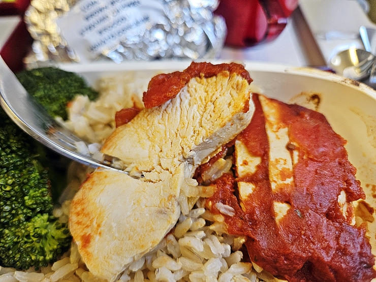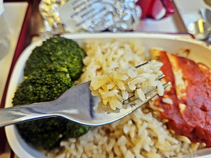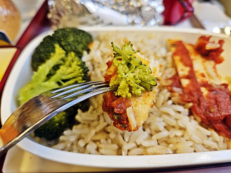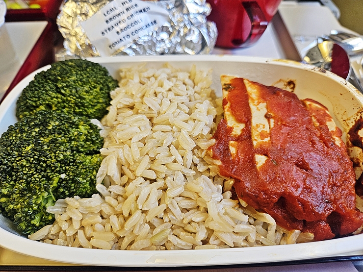 저열량식 기내식에는 현미, 닭, 브로콜리와 토마토 콩카세가 들어간다. 토마토 콩카세는 토마토를 으깬 것인데 그냥 토마토 소스라고 생각하면 된다. 뭐 이리 어려운 말을 썼는지 모르겠다.