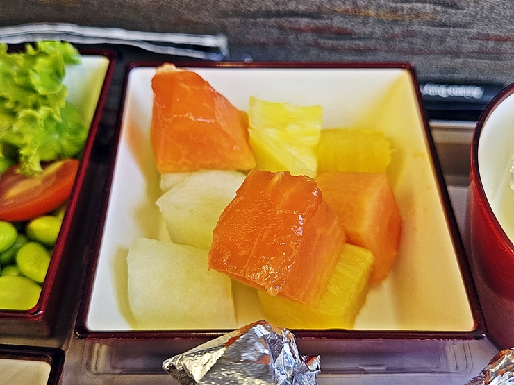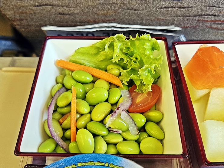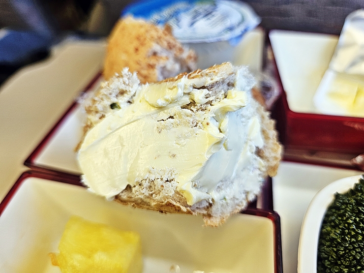 빵과 저열량 버터도 나온다. 저열량이라 그런지 버터 특유의 고소하고 진한 맛은 크게 떨어졌다. 빵도 반 정도 먹고 남겼지. 딱히 추천하고 싶진 않지만 기내에서 열량이 낮은 기내식을 먹고 싶다면 한 번 정도는 먹어볼 가치는 있다.