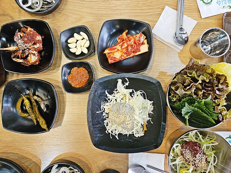 반찬. 양념게장, 고추 장아찌, 마늘, 쌈장. 김치, 샐러드, 파무침, 양파 장아찌와 쌈 채소가 나온다. 쌈 채소는 깻잎, 상추와 양배추가 나온다. 양배추가 나오는 것이 특이했다.