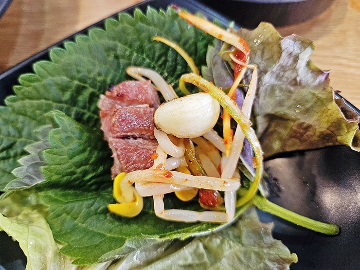 채소를 많이 먹으라는 짝꿍의 말을 잊지 않고 상추와 깻잎 위에 목살을 넣고 그 위에 파 무침, 마늘과 쌈장을 올려서 먹었다. 목살의 고소한 맛이 잘 느껴지면서도 부드러운 식감이 상당히 좋았다. 비록 목살이 삼겹살에 비해 판매량이 적긴 하지만 목살 역시 참으로 훌륭한 부위가 아닐 수 없지.