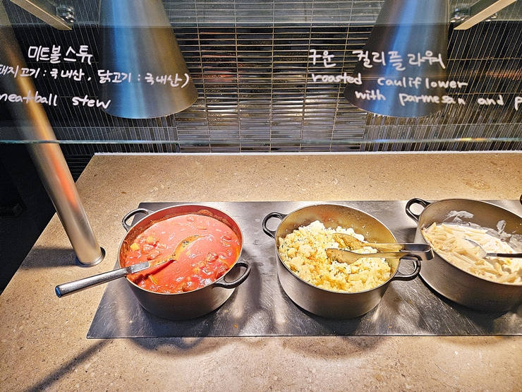 한식 코너에는 이렇게 무 생채, 김치, 가지 볶음, 콩나물, 쌈장, 고추장과 김 등 다양한 반찬이 있다. 육수와 소면도 있어서 잔치 국수를 말아 먹을 수 있다.