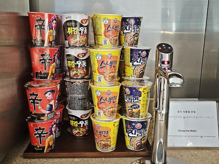 한국인의 영원한 친구 컵라면도 준비 되어 있다. 컵라면의 경우 외부 반출을 할 수 없도록 뚜껑이 개봉 되어 있다. 컵라면은 신라면, 튀김 우동, 스낵면과 진라면이 있다. 나는 라면을 즐기는 편이 아니라서 사진만 한 장 찍었다. 다들 라면을 많이 가져가는 모습이었고 신라면이 가장 인기가 좋았다.
