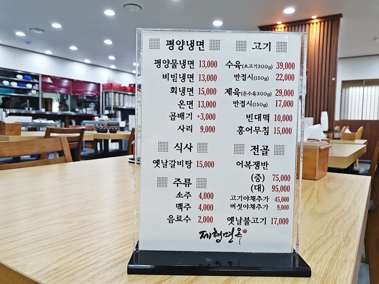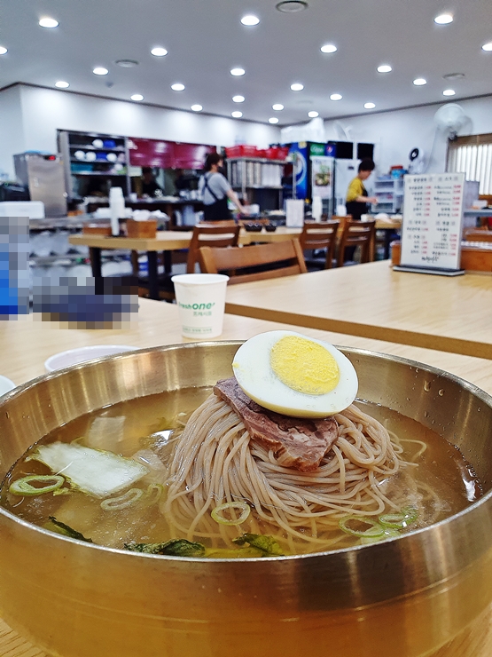 매장은 굉장히 넓다. 좌석간 거리도 은근히 여유가 있다. 우리가 방문했을 때는 약 4시 정도에 도착했기 때문에 냉면을 즐기는 고객이 많이 없었다. 계모임, 부녀회 등으로 보이는 여자 고객이 단체로 들어와서 호호 수다를 떨고 있었다. 고객이 많이 없어서 그랬는지 그 목소리가 마치 군인처럼 크고 호탕했다. 많은 사람들이 만나서 신이 난 것은 알겠지만 그래도 목소리는 조금 적당했으면 좋겠다.