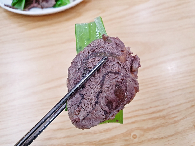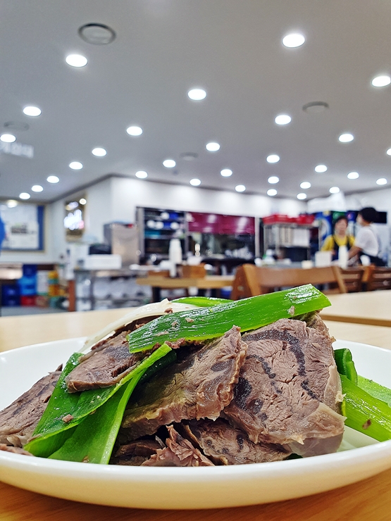 아름다운 모습의 아롱사태 수육. 아롱사태는 사태 안쪽에 있는 부위로 일반적인 사태의 식감과 달리 쫄깃함과 부드러움을 함께 지니고 있다. 보통 수육으로 많이 먹는 편인데 그 특유의 풍미와 향이 있다. 제형면옥의 수육은 고기만 나오는 것이 아니라 파와 함께 나온다. 난 파를 무척 좋아하는데 파와 함께 먹으면 더욱 훌륭한 맛을 느낄 수 있다.