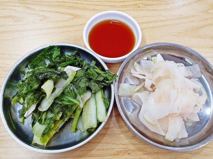 수육을 찍어 먹을 소스, 열무김치와 무절임. 와, 이 집 열무김치 미쳤다. 진짜 미쳤다는 말 이외에는 맛을 설명할 수 없다. 아삭함을 간직하고 식감과 더불어 시원한 맛이 일품이다. 무절임도 맛있긴 했지만 상대적으로 열무김치에 밀렸다. 나와 짝꿍은 열무김치를 리필해서 계속 맛있게 먹었다.