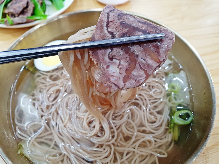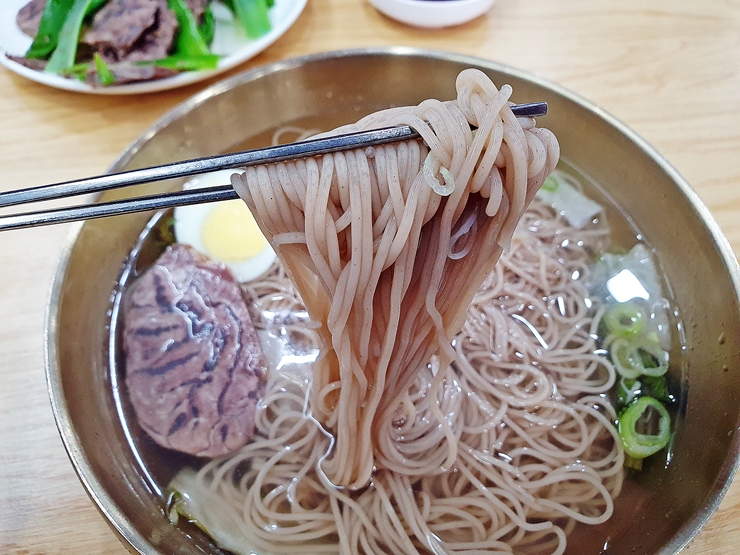 면은 필동면옥, 우래옥 같은 곳과 조금 다르다. 메밀의 함량이 상대적으로 떨어지는 느낌이 든다. 그리고 상대적으로 쫄깃함이 느껴진다. 다만 메밀의 맛은 확실하게 느낄 수 있다. 메밀의 식감과 맛에 익숙하지 않은 사람이라면 만족스럽게 먹을 수 있겠지만, 평양냉면 매니아들에게는 조금 아쉬울 수 있을 맛이다.