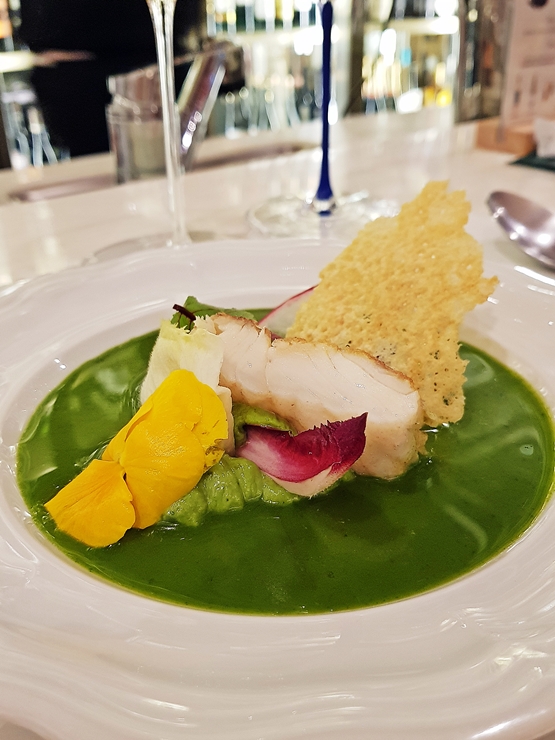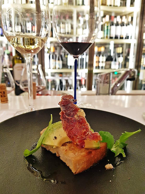 아뮤즈 부쉬. 바게트 위에 아보카도와 햄을 올렸다. 예전에는 아보카도를 참 좋아했는데, 요새는 이도 저도 아닌 맛으로 느껴져서 그다지 잘 먹지 않고 있다. 하지만 이렇게 근사하게 나올 때는 맛있게 먹어야지. 식욕을 돋우기에 적절한 맛이었다. 아뮤즈 부쉬 특성상 양이 많지 않은 것이 아주 조금 아쉬웠지만, 다음 코스를 기다리며 와인을 마셨다.