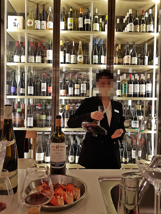 임페리얼 리오하 리제르바를 디캔딩 하는 소믈리에. 양해를 구하고 사진을 한 장 찍었다. 임페리얼 리오하 리제르바는 스페인 와인으로 미국, 프랑스 오크 통을 사용하여 24개월 동안 숙성을 하고 출하한다. 상당히 드라이하고 산미가 있는 편이어서 와인 초심자가 즐기기에는 조금 진입 장벽이 있는 편이다. 나 역시 와인 초심자이기 때문에 이런 드라이한 와인보다 스윗한 와인이 좋은 편이다. 와인에 대한 조예가 깊지 않기 때문에 더 이상의 자세한 설명은 못하겠다.