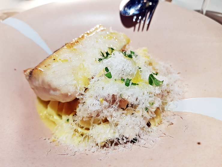 삼치 딸리아뗄레. 구운 삼치를 넣어 만든 파스타다. 삼치는 등푸른생선 계열이지만, 맛은 흰살생선과 흡사한 맛이 나는 개성이 있다. 그래서 등푸른생선 특유의 비린내를 싫어하는 사람들도 거부감 없이 즐길 수 있다. 담백한 삼치를 잘게 부셔서 파스타와 함께 비벼 먹어도 좋고 떠 먹어도 좋다. 우리는 잘게 부순 후 비벼 먹었다. 파스타 크림과 삼치의 맛이 잘 어울려서 만족스럽게 즐겼다.