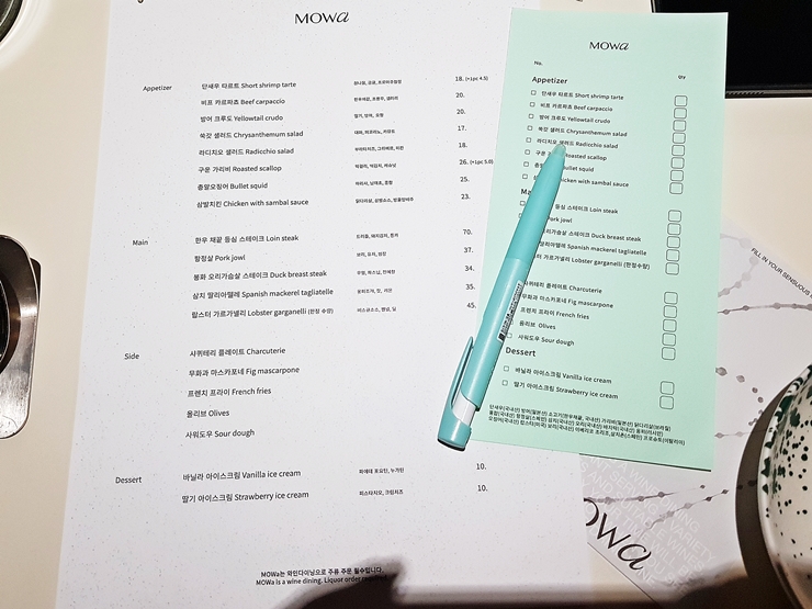 메뉴. 다이닝 와인 바를 지향하고 있는 모와는 그와 걸맞게 다양한 와인과 더불어 수준 높은 요리도 준비 되어 있다. 호텔에 있는 곳이기 때문에 전체적으로 가격대는 좀 높게 구성이 되어 있지만, 마냥 비싼 가격은 아니어서 크게 부담은 없는 편이다. 난 와인은 아직 공부를 하고 있기 때문에 와인 선택권은 양보를 하고 내가 먹고 싶은 것들을 몇 개 주문하기로 했다.